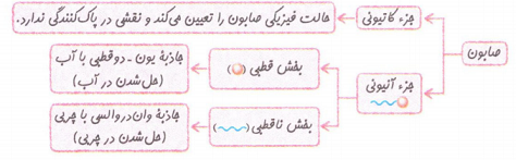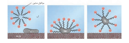 نیروی جاذبه میان مولکول های آب و صابون به اندازه ای است که باعث پخش شدن صابون در آب می شود؛ به عبارت دیگر نیروی جاذبه میان مولکول های آب و صابون در مخلوط، از میانگین نیروهای جاذبه میان مولکول های آب و میان مولکول های صابون بیشتر است (میان بخش قطبی جزء آنیونی صابون و مولکول های آب، جاذبه یون - دوقطبی ایجاد می شود. در ضمن مخلوط آب و صابون، خاصیت بازی دارد. می دانید که کاغذ پی اچ درمحیط های اسیدی به رنگ سرخ و در محیط های بازی به رنگ آبی در می آید؛ پس کاغذ پی اچ در مخلوط آب و صابون، به رنگ آبی در خواهد آمد. به همین ترتیب هرگاه مقداری صابون مایع رادر روغن بریزیم و مخلوط را به هم بزنیم، مخلوط به ظاهر همگنی به دست می آید. این مشاهده نشان می دهد که بین بخش ناقطبی صابون و مولکول های ناقطبی روغن، نیروی جاذبه واندروالسی برقرار می شود؛ به همین دلیل مولکول های صابون در سرتاسر روغن مایع پخش می شوند. خلاصه این که صابون ماده ای است که هم در چربی ها و هم در آب حل می شود.حالا به راحتی میشه فهمید که صابون چه جوری چربی ها را پاک می کند. چربی ها ناقطبی هستند؛ به همین دلیل آب به تنهایی نمی تواند چربی ها را پاک کند. وقتی صابون وارد آب می شود، کاتیون و آنیون آن از هم جدا می شوند.