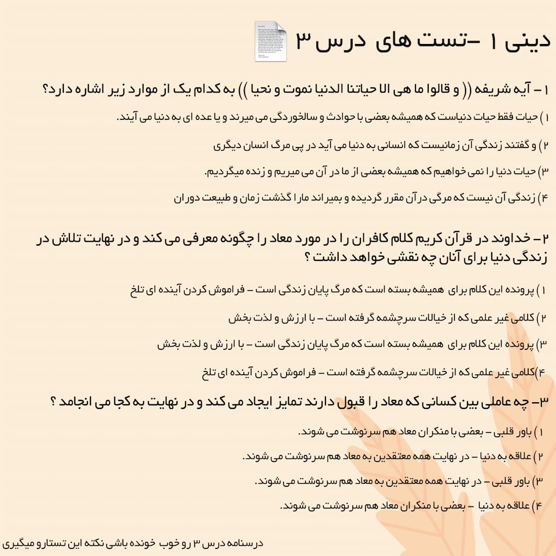 تست های مفیدوکاربردی درس 3 مبحث را باهم تمرین خواهیم داشت. فراموش نکنید که ابتدا خودتون روی تست ها تمرین و فکر کنید سپس به پاسخ نامه مراجعه کنید.