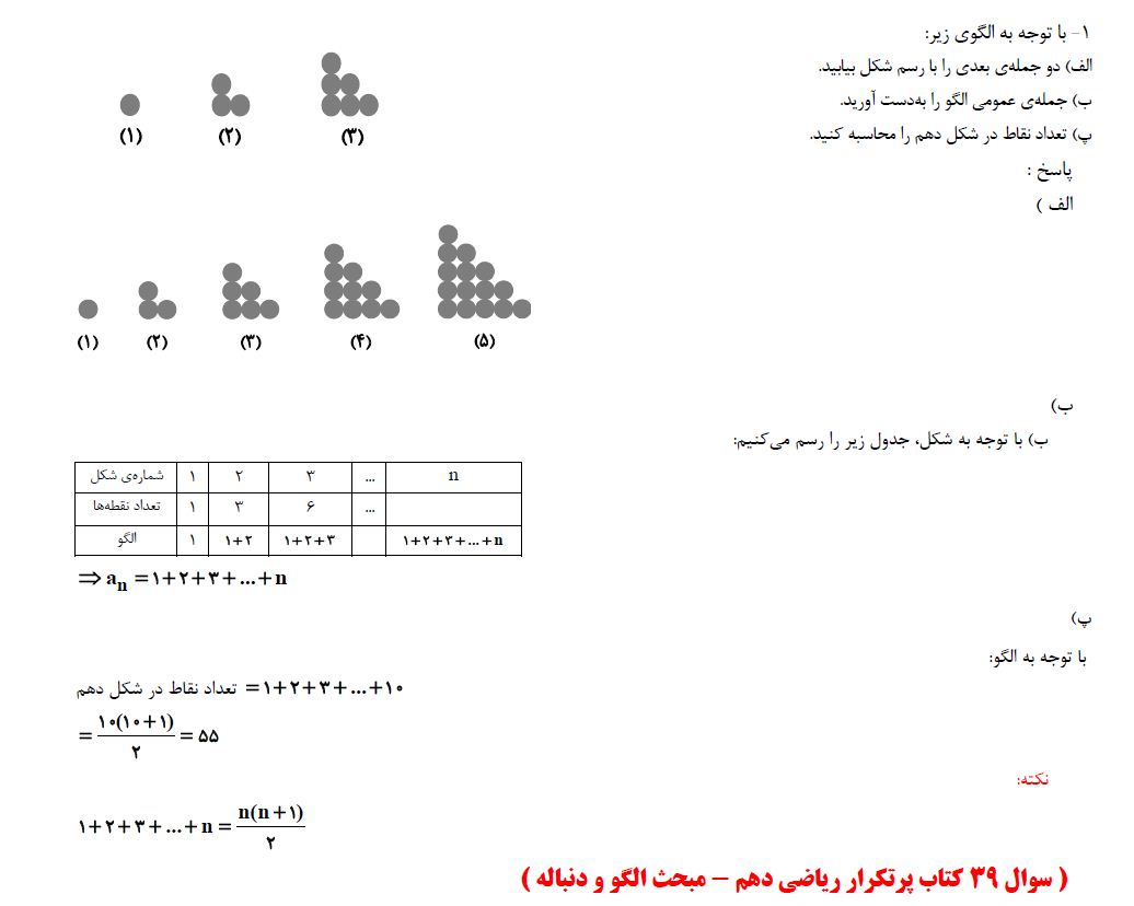 برای آمادگی بیشتر در این مطلب 4 سوال از کتاب پرتکرار ریاضی دهم ، مبحث الگو و دنباله آمده است ، برای تمرین بیشتر می توانید به کتاب پرتکرار ریاضی دهم مراجعه کنید.