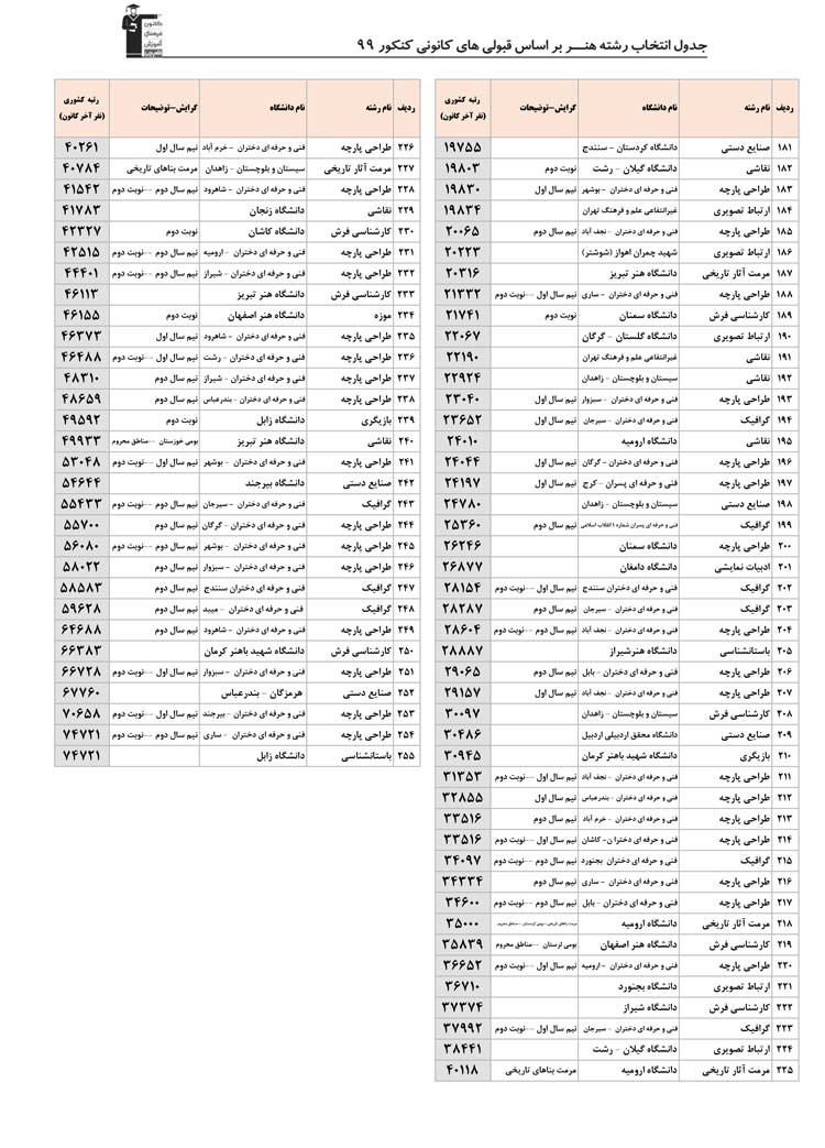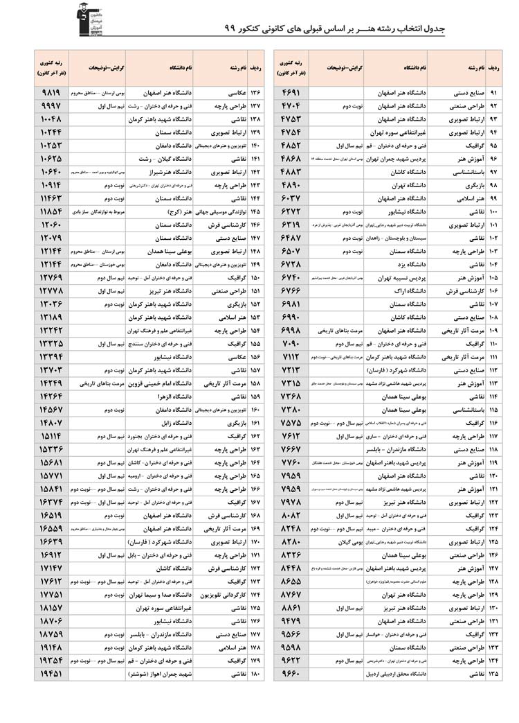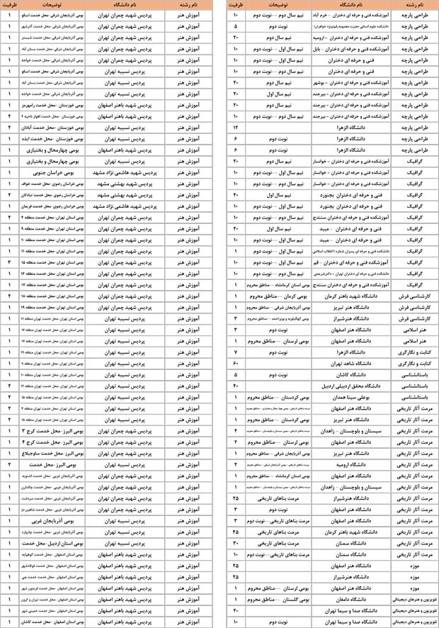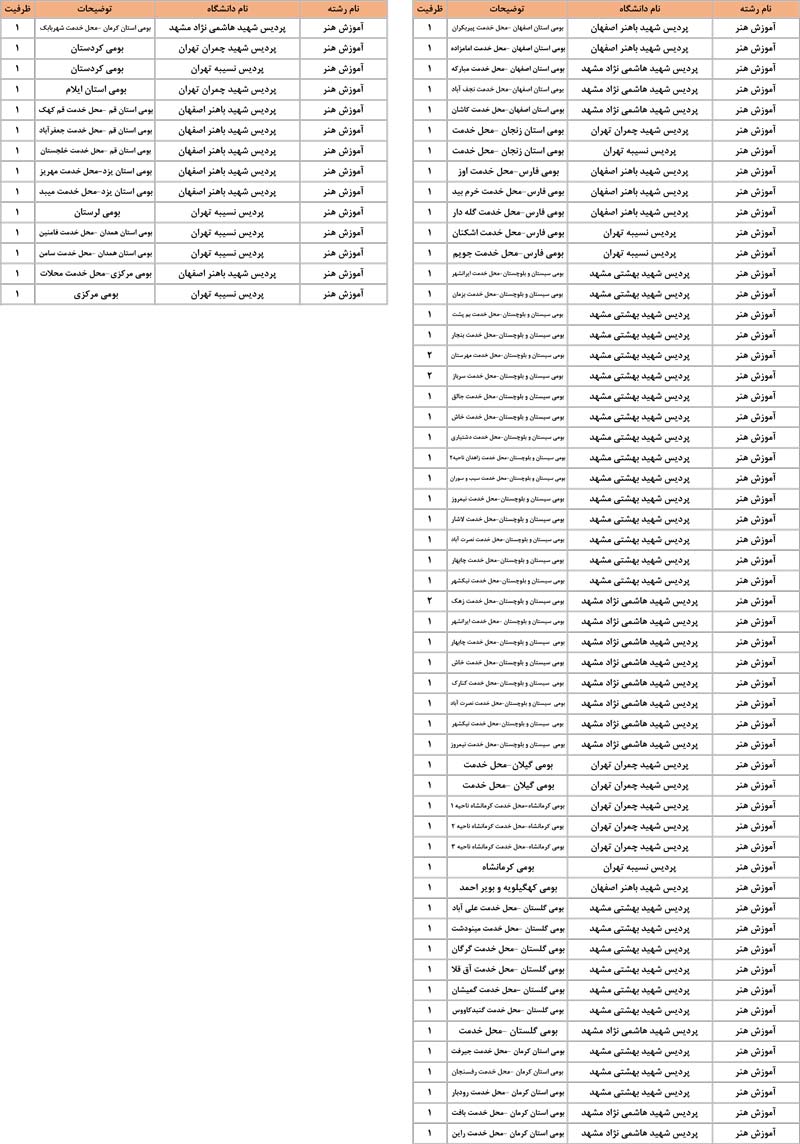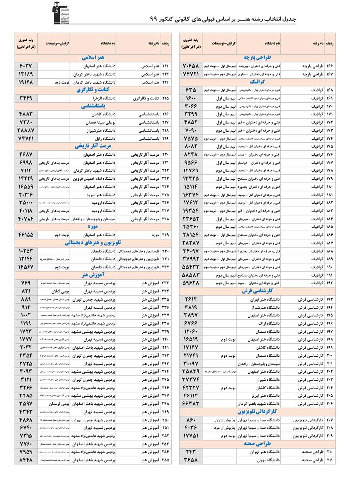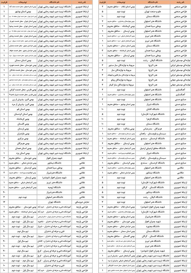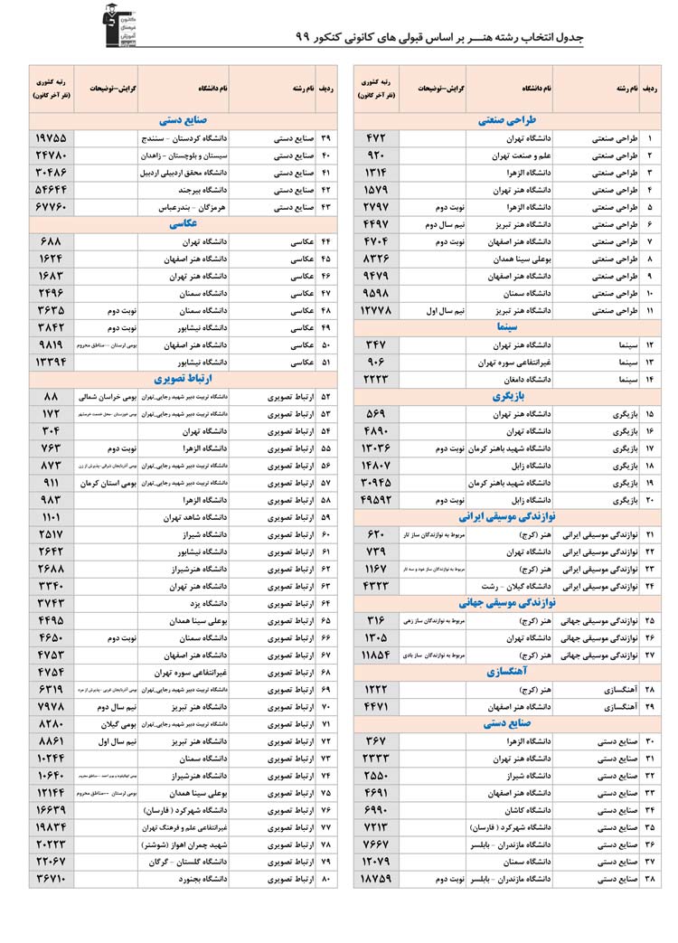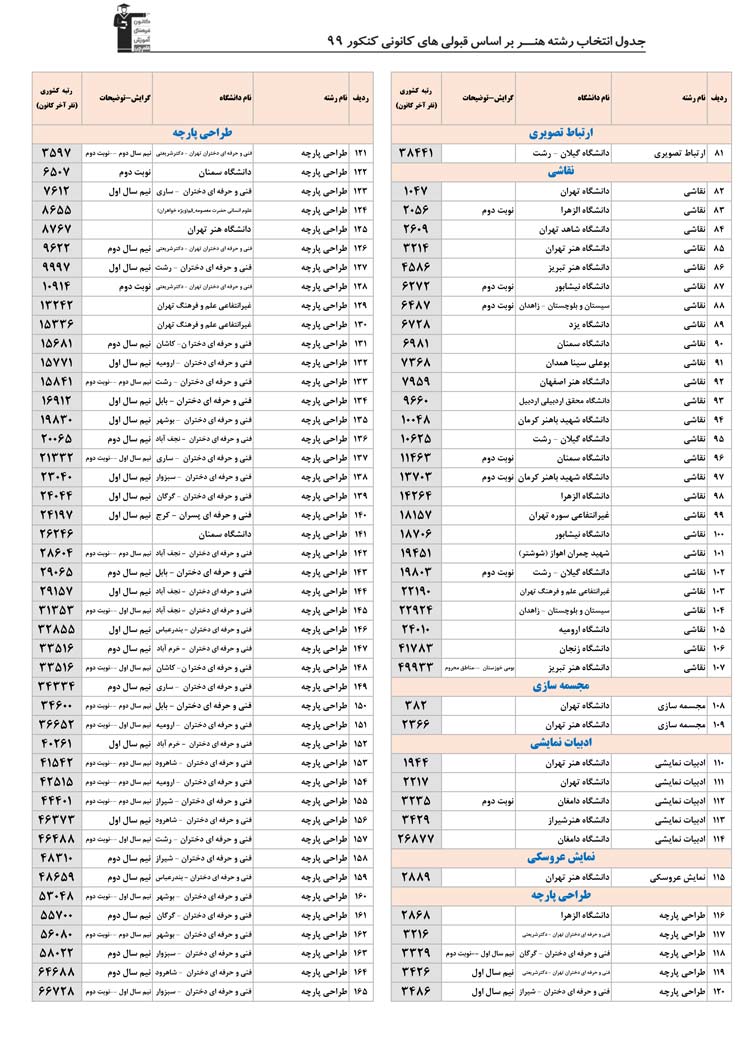 بخش دوم :به ترتیب رشته ها در بخش دوم رشته های گروه هنر را می بینید . در هر رشته همه ی دانشگاه ها و شهرهایی که آن رشته را دارند مشاهده می کنید . مثلا همه ی دانشگاه هایی که رشته ی عکاسی یا طراحی صنعتی یا هر رشته ی دیگر را دارند در یک جا و پشت سرهم می بینید . این بخش به شما کمک می کند تا اگر هر رشته ای را ترجیح می دهید همه ی اطلاعات آن رشته را در یک جا و کنار هم ببینید