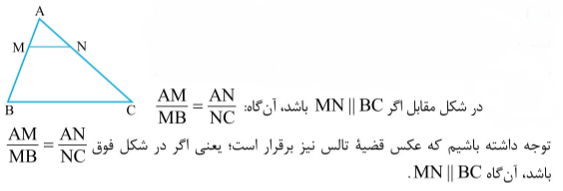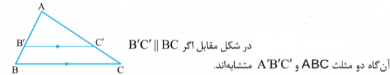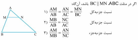 قضیه تالس : اگر یک خط با ضلعی از مثلث موازی باشد و دو ضلع دیگر را قطع کند داریم: