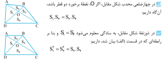 نکته : اگر دو مثلث قاعده های برابر داشته باشند نسبت مساحت های آنان برابر نسبت ارتفاع های نظیر قاعده آنان است و بلعکس.
