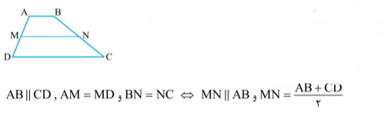 میان خط در ذوزنقه : پاره خطی که وسط های دو ساق را به هم وصل میکند که موازی دو قاعده و برابر نصف مجموع قاعده هاست.