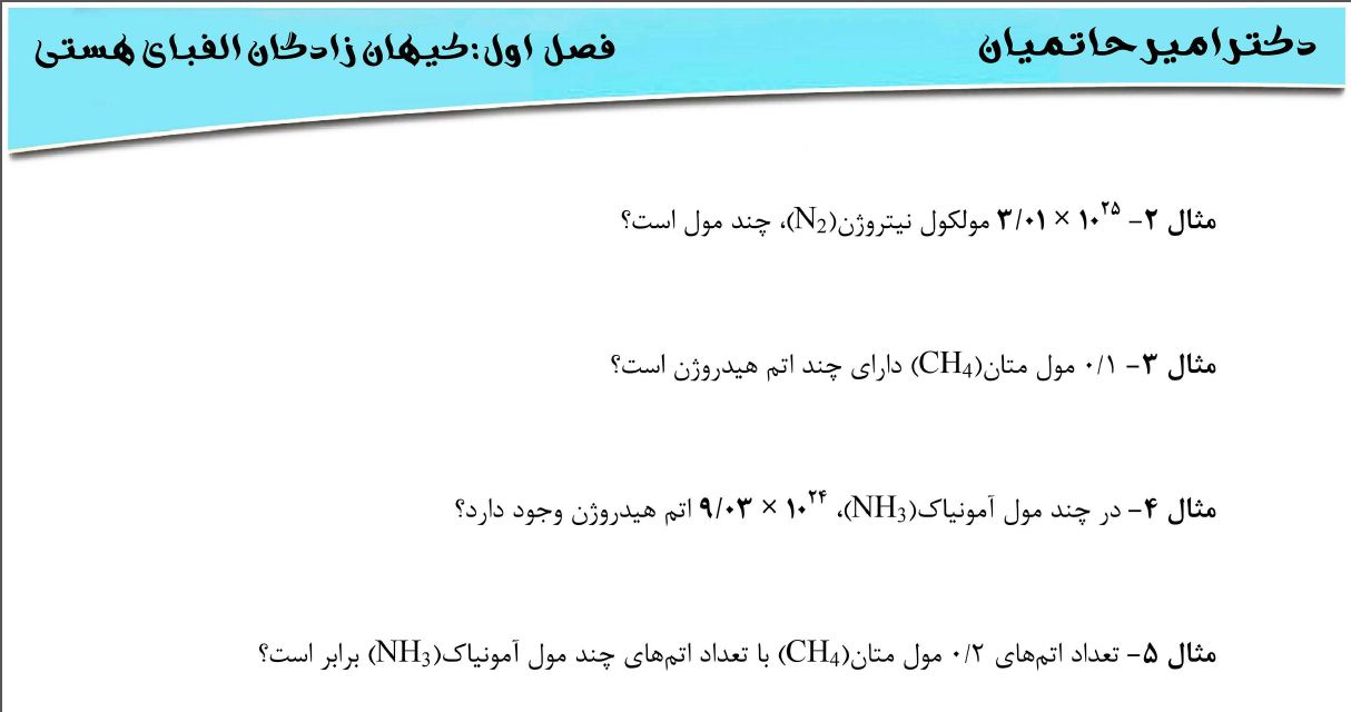 درسنامه ای کوتاه از فصل 1 کتاب شیمی دهم تجربی ( محاسبه تعداد ذرات یک ماده ، جرم مولی و ... ) تهیه شده توسط دکتر امیر حاتمیان