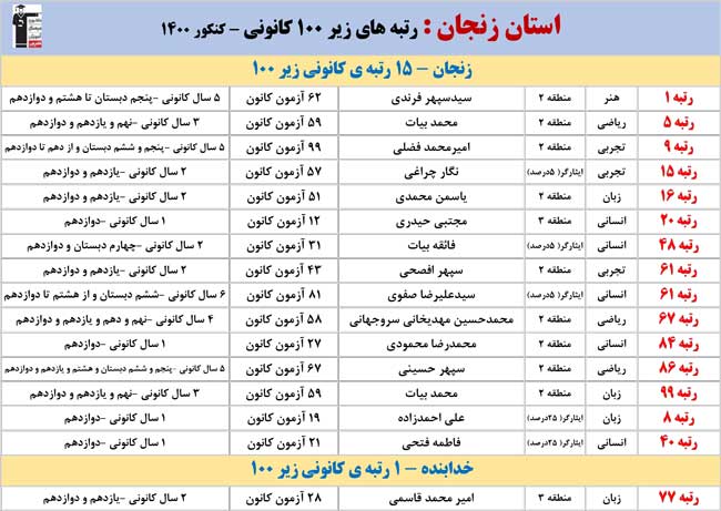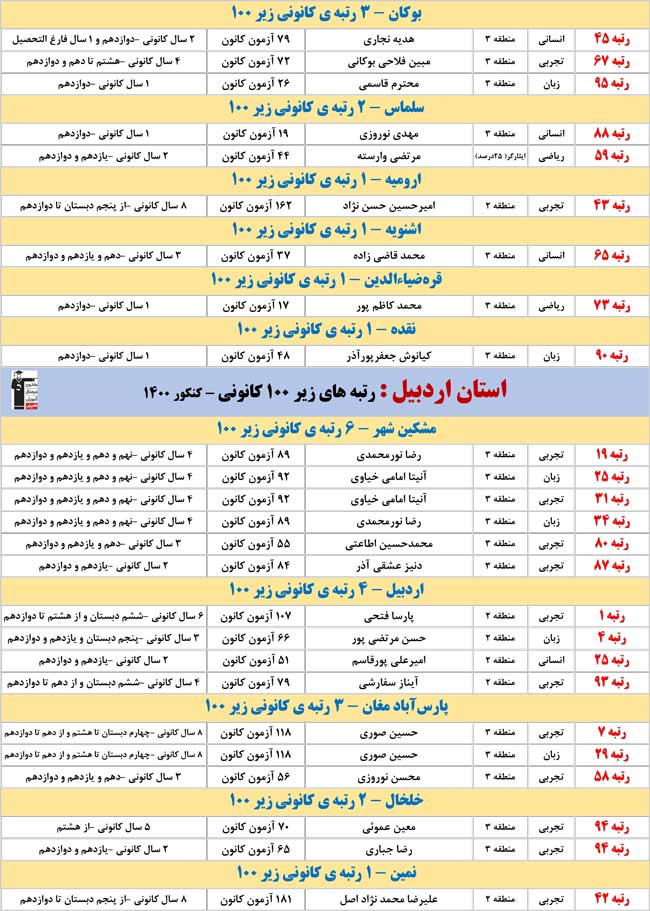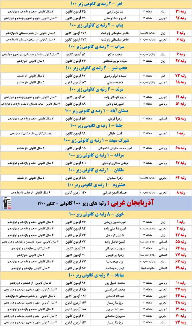 رتبه های زیر 100 کانون کنکور 1400 در استان های آذربایجان شرقی ، آذربایجان غربی ، اردبیل ، زنجان را در ادامه مشاهده کنید.
