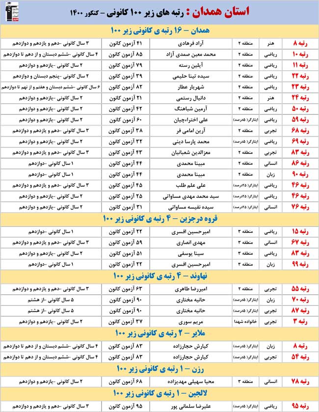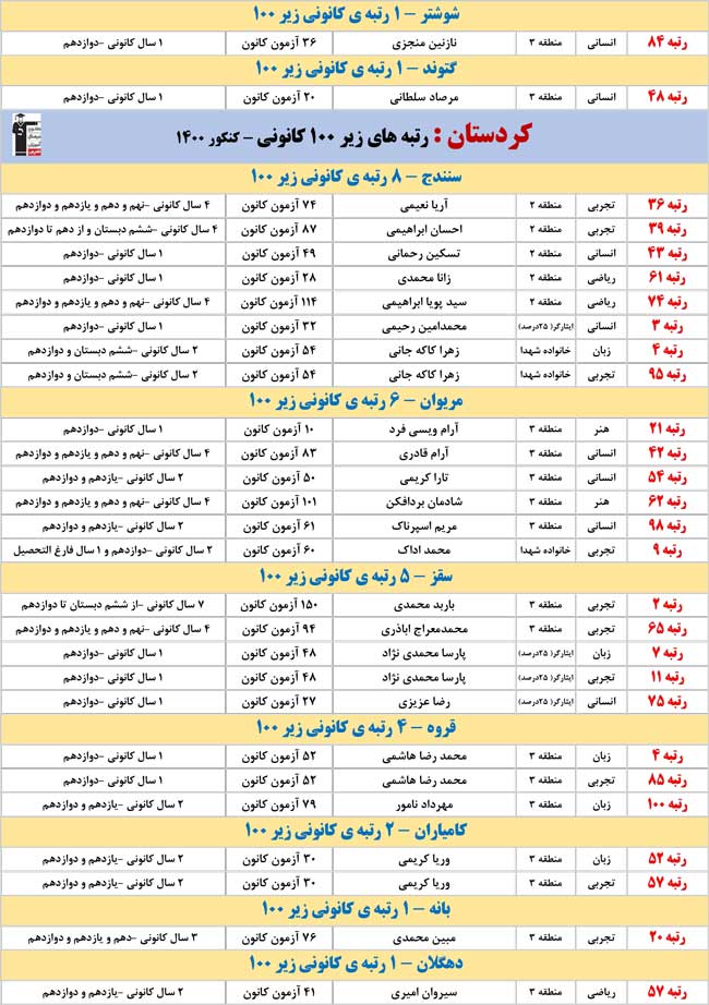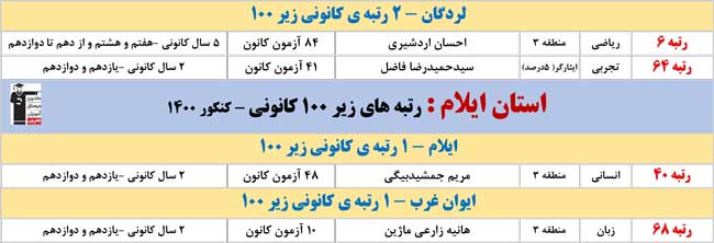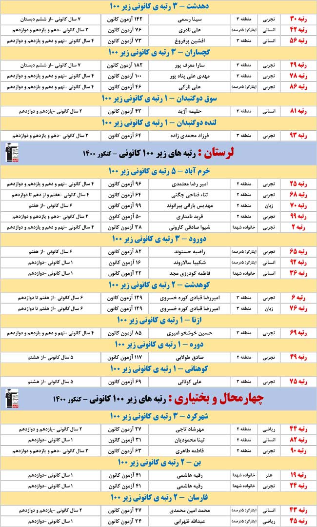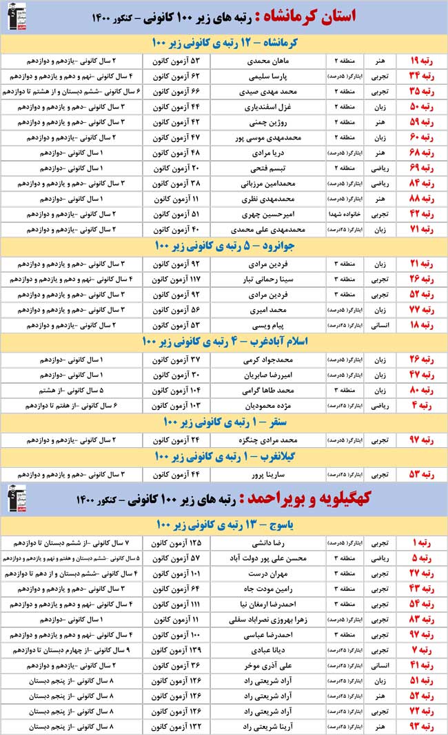 رتبه های زیر 100 کانون کنکور 1400 در استان های خوزستان ، کردستان ، همدان ، کرمانشاه ، کهکیلویه و بویراحمد ، لرستان ، چهارمحال و بختیاری ، ایلام را در ادامه مشاهده کنید.