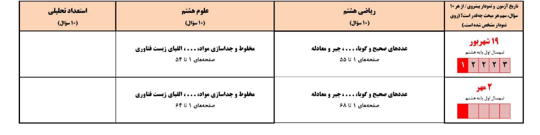 کانون برای همهی دانشآموزان دو آزمون هدیه در نظر گرفته است. یکی ۱۹ شهریور و دیگری ۲ مهر. برنامهی این دو آزمون را برای دانشآموزانی که از مهر امسال به پایهی هشتم میروند، در تصویر زیر میبینید:
