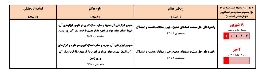 کانون برای همهی دانشآموزان دو آزمون هدیه در نظر گرفته است. یکی ۱۹ شهریور و دیگری ۲ مهر. برنامهی این دو آزمون را برای دانشآموزانی که از مهر امسال به پایهی هفتم میروند، در تصاویر زیر میبینید: