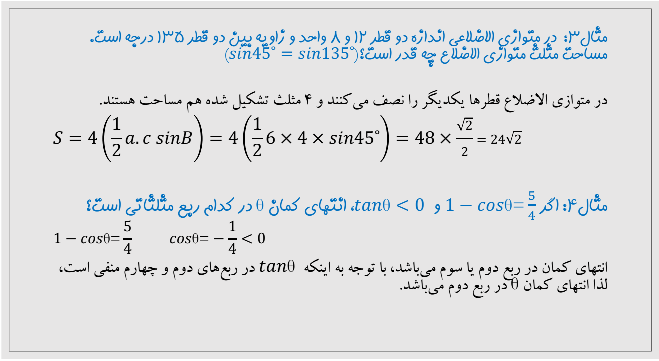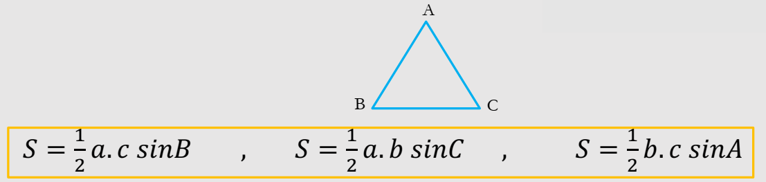 1. مساحت مثلث: اگر دو ضلع یک مثلث و زاویه این دو ضلع معلوم باشد، میتوان از رابطههای زیر مساحت مثلث را محاسبه نمود.