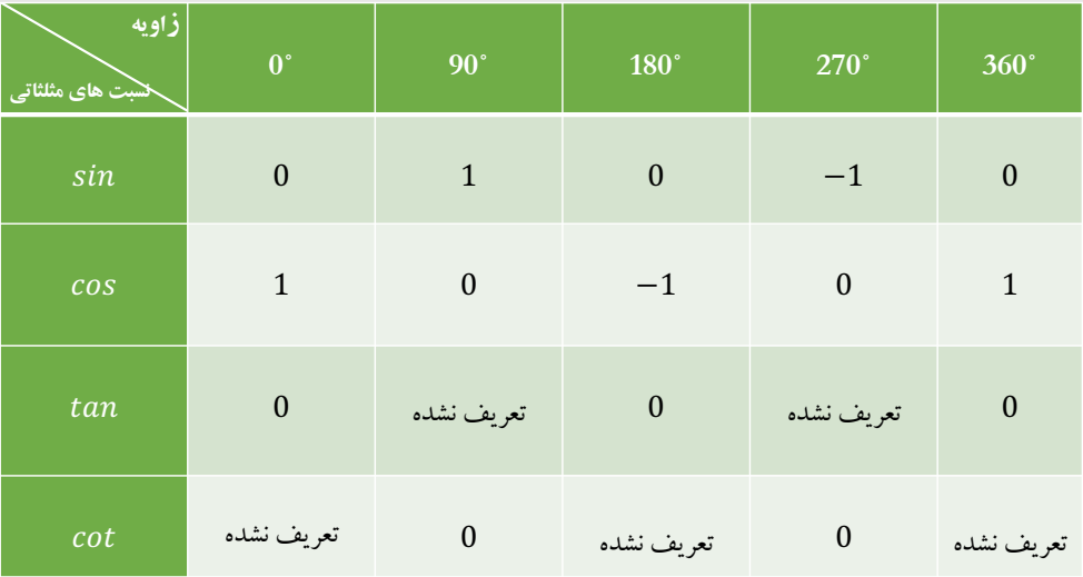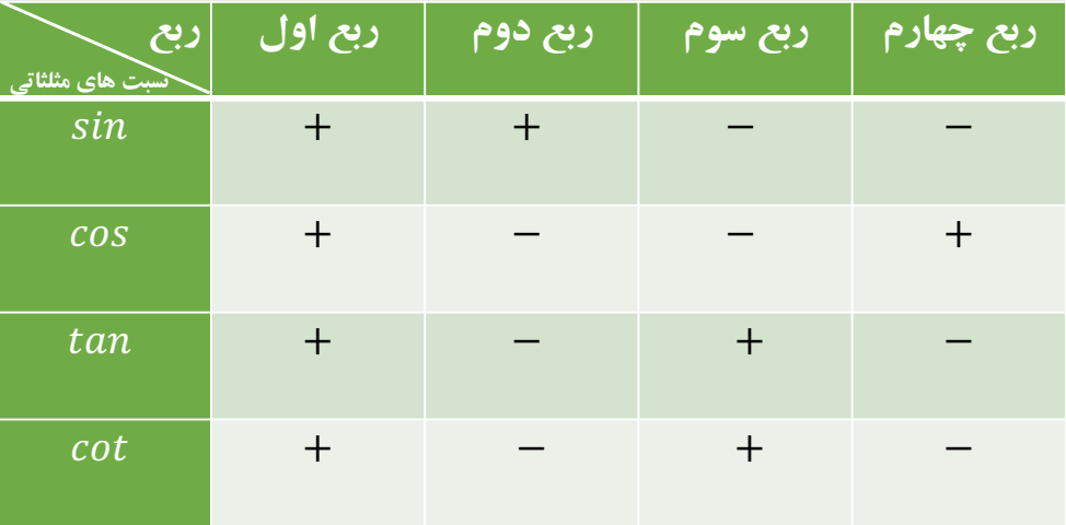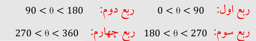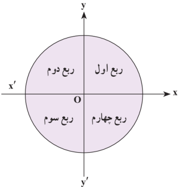 محور افقی را محور کسینوسها و محور عمودی را محور سینوسها مینامند، این دو محور صفحه را به 4 قسمت تقسیم میکنند. به هر یک از این قسمتها یک ناحیه یا ربع میگویند.