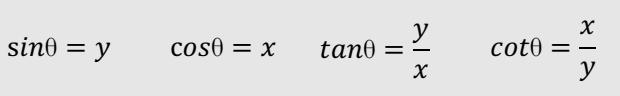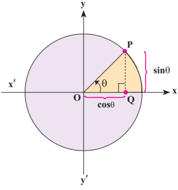 اگرP نقطهای دلخواه روی دایره مثلثاتی باشد و θ زاویه ای باشد که نیمخط OP روی محور x ها میسازد. در اینصورت با توجه به آنکه شعاع دایره مثلثاتی یک است، در مثلث OPQ، نسبت مثلثاتی را میتوان به صورت زیر نمایش داد: