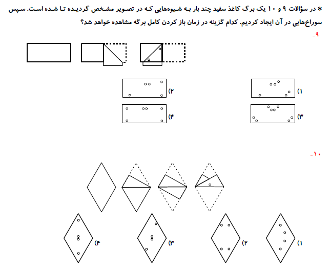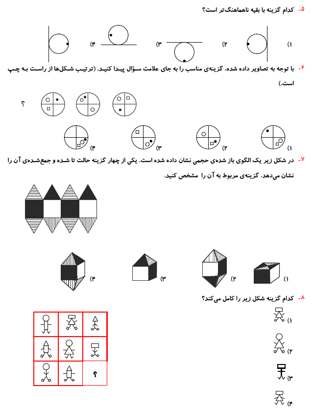 در ادامه برای شما 10 سوال هوش تصویری و فضایی برای آمادگی آزمون 12 شهریور آورده شده است. این سوالات را پاسخ دهید و سپس پاسخ خود را با فایل پی دی اف که بعد از سوالات برای شما قرار داده شده است مقایسه کنید.