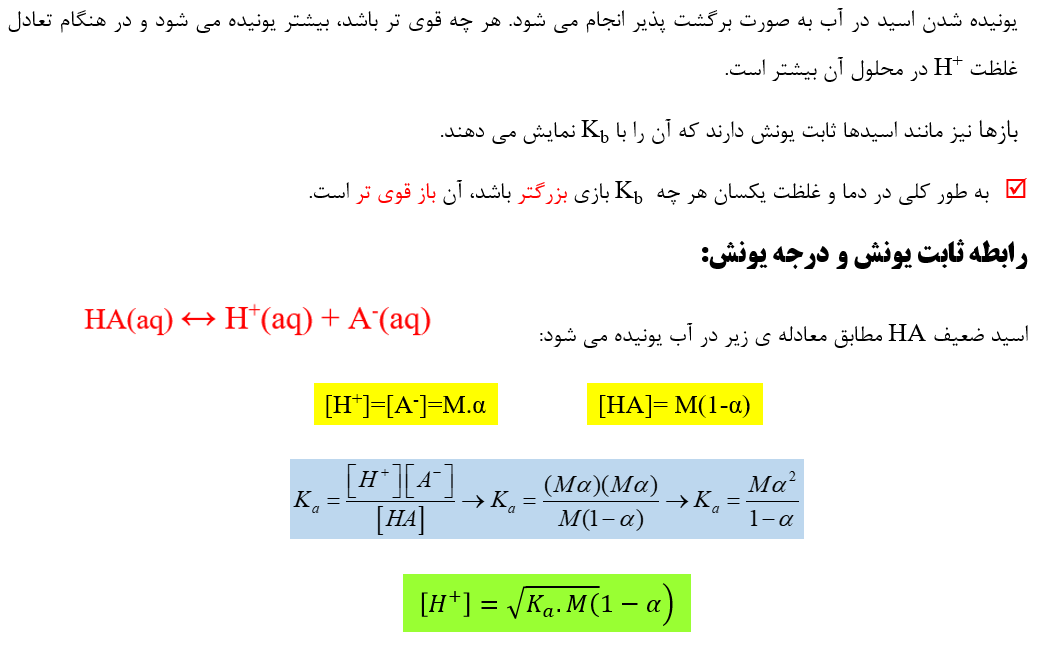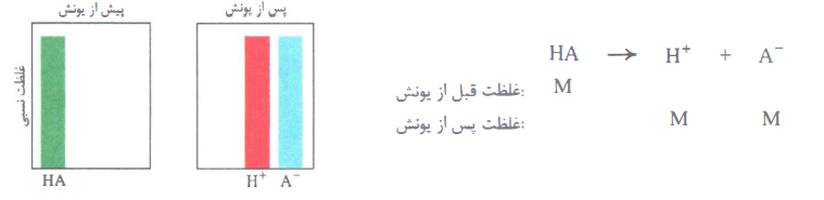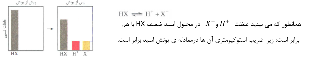 اسیدهای ضعیف: با حل شدن در آب به طور جزئی یونش می یابند؛ یعنی تعداد کمی از مولکول های اسید به یون تبدیل می شوند و در محلول، علاوه بر یون های آبپوشیده، مولکول های اسید نیز وجود دارند. معادله یونش اسیدهای ضعیف در آب را به صورت دوطرفه (برگشت پذیر) نشان می دهیم: