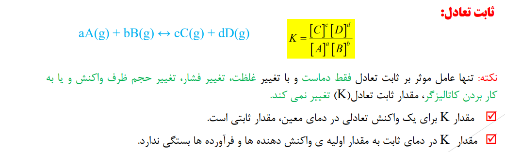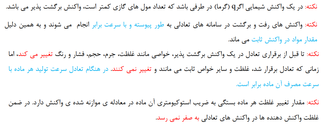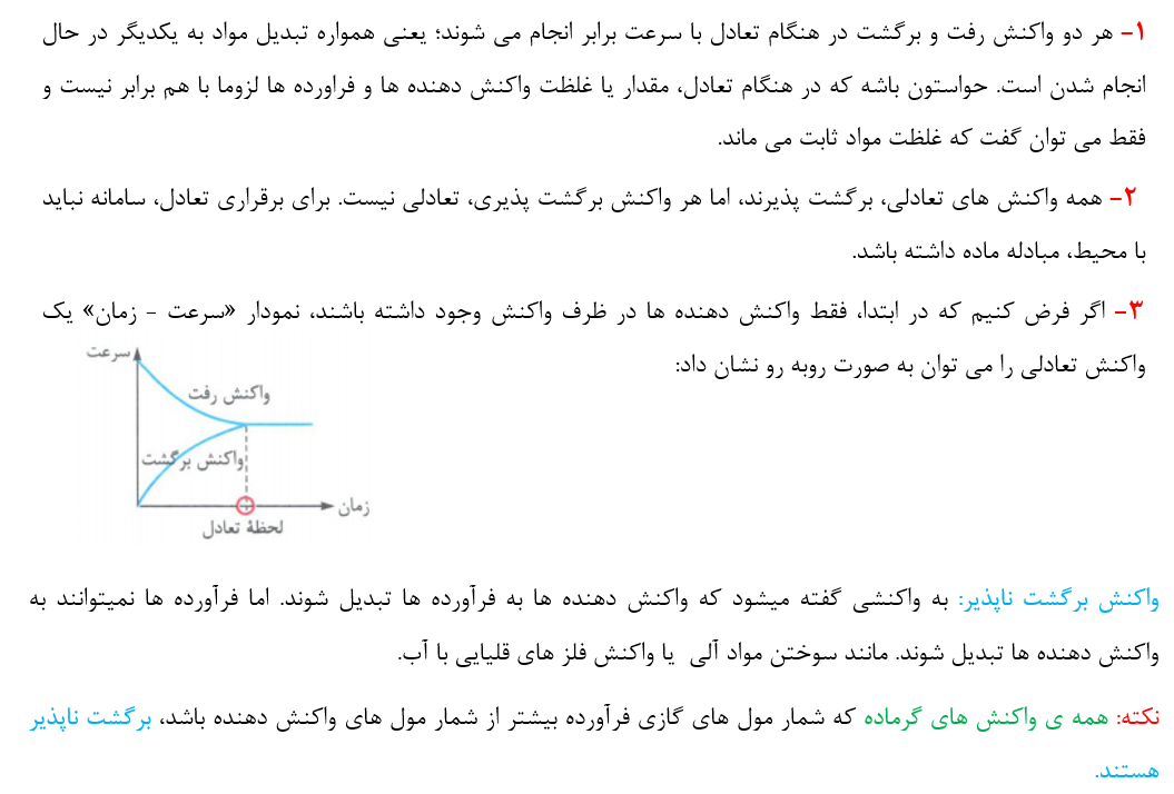 اگه یادتون باشه ! گفتیم که در محلول اسیدهای ضعیف، یون های آبپوشیده به طور همزمان با مولکول های اسید یونیده نشده حضور دارند؛ به طوری که در شرایط معین، غلظت همه گونه های موجود در محلول، ثابت است. حضور همزمان یون ها و مولکول های یونیده نشده با غلظت ثابت در محلول نشان میدهد که محلول اسیدهای ضعیف در آب یک سامانه تعادلی است. حالا ببینیم تعادل یعنی چی؟! در شیمی دهم خواندیم که به واکنش هایی که می توانند در هر دو جهت رفت (تبدیل واکنش دهنده ها به فراورده ها) و برگشت (تبدیل فراورده ها به واکنش دهنده ها) انجام شوند، واکنش های برگشت پذیر می گویند. اگر این واکنش ها در شرایط مناسبی انجام شوند، سرانجام لحظه ای فرا می رسد که سرعت واکنش رفت با سرعت واکنش برگشت برابر می شود. در این لحظه، غلظت واکنش دهنده ها و فراورده ها ثابت می ماند؛ به طوری که همان مقدار از واکنش دهنده ها که در واحد زمان طی واکنش رفت مصرف می شوند، در اثر واکنش برگشت، دوباره تولید می شوند. به همین ترتیب همان مقدار از فراورده ها که در یک واحد زمان طی واکنش رفت تولید می شوند، در اثر واکنش برگشت مصرف می شوند. در این حالت می گوییم واکنش به تعادل رسیده است. برای واکنش های تعادلی از نماد ⇋ استفاده می شود.