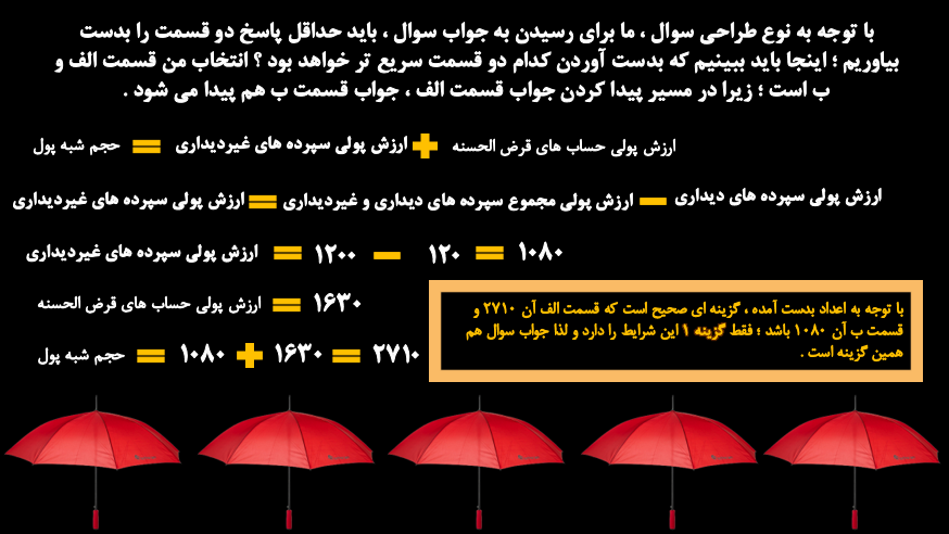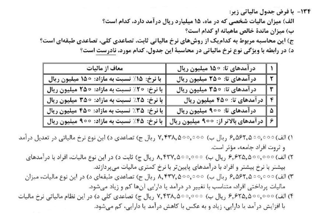در این سوال با علم به اینکه وقتی کلمه مازاد را می بینیم ، نرخ مورد نظر ما ، تصاعدی طبقه ای است ، گزینه 2 و 4 را خط می زنیم و گزینه 1 و 3 را نگه می داریم . دقت کنید که گزینه 1 بیان کرده که نرخ مورد نظر ، تصاعدی است ؛ و این بدین معنا نیست که آن نمی تواند تصاعدی طبقه ای باشد ؛ لذا آن را هم نگه می داریم . قسمت د ، یک عبارت حفظی را بیان کرده است و طبق خواسته سوال ، باید گزینه ای را انتخاب کنیم که عبارت بیان شده اش در قسمت د نادرست باشد ؛ گزینه 1 در قسمت د بیان کرده که این نرخ مالیاتی در تعدیل درآمد افراد جامعه موثر است و از آنجایی که این عبارت درست است ، جواب ما می شود گزینه 3 ؛ زیرا ما دنبال عبارت نادرست هستیم . در این نوع نرخ مالیاتی ، نرخ مالیات با تغییر در درآمد یا دارایی افراد کم و زیاد می شود و میزان مالیات پرداختی با جزئی افزایش یا کاهش ، بشدت تغییر نمی کند . با یک راه دیگر هم میتوان این سوال را حل کرد ؛ قسمت الف سوال از ما میزان مالیات ماهانه فردی را خواسته که در ماه 15 میلیارد ریال درآمد دارد و قسمت ب هم از ما مانده خالص ماهانه او را می خواهد ؛ قسمت الف گزینه 1 و 3 یکسان است و این یعنی یک فرصت فوق العاده برای رسیدن سریع تر به جواب !