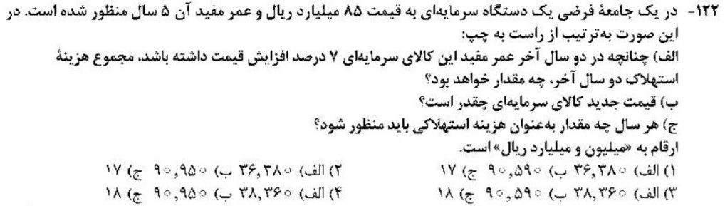 در این نوع سوال ، با بدست آوردن قسمت ج و سپس قسمت ب ، می توانیم به جواب سوال برسیم . قسمت ج از ما هزینه استهلاک را خواسته که باید برای رسیدن به آن ، قیمت کالا را بر عمر مفید آن تقسیم کنیم ؛ با تقسیم 85 بر 5 ، به عدد 17 می رسیم که هزینه استهلاک را نشان می دهد و لذا جواب بین گزینه های 1 و 2 است . قسمت ب از ما قیمت جدید کالای سرمایه ای را می خواهد که طبق آن چیزی که طراح سوال در قسمت الف گفته ، این کالای سرمایه ای 7 درصد افزایش قیمت داشته است ؛ برای رسیدن به قیمت جدید ، باید 7 درصد قیمت اولیه را محاسبه و سپس با آن جمع کنیم :