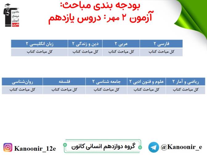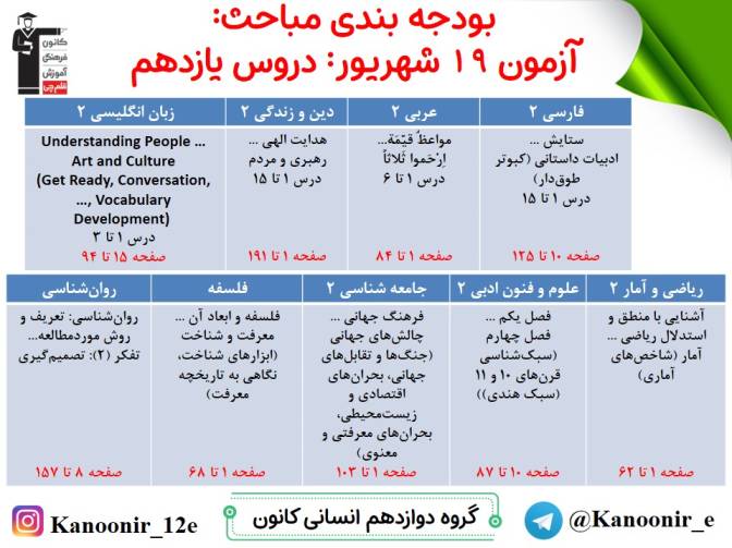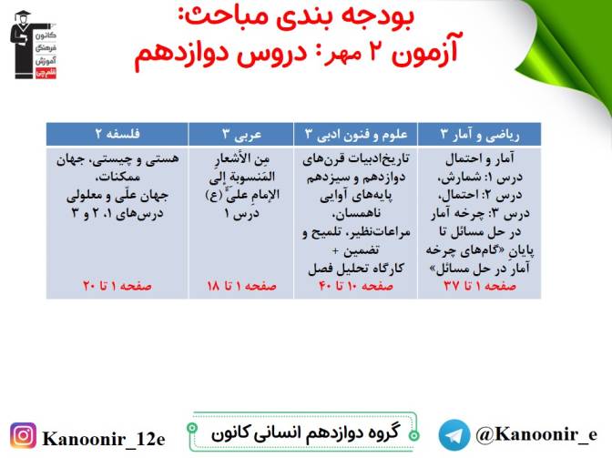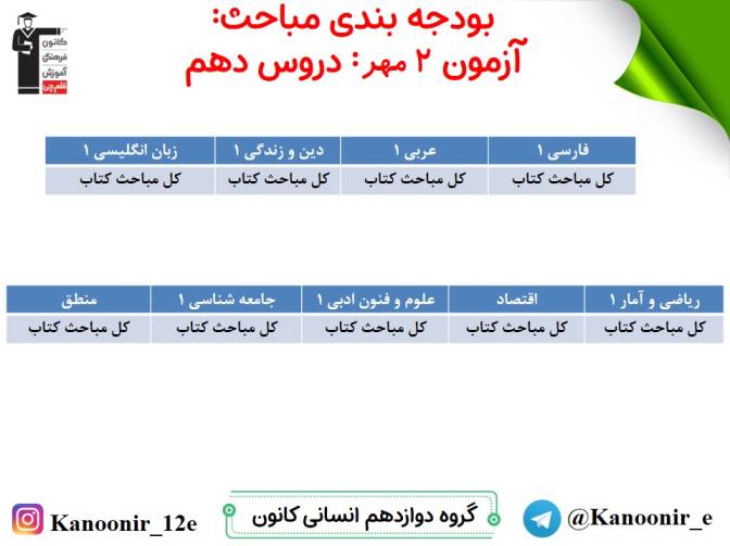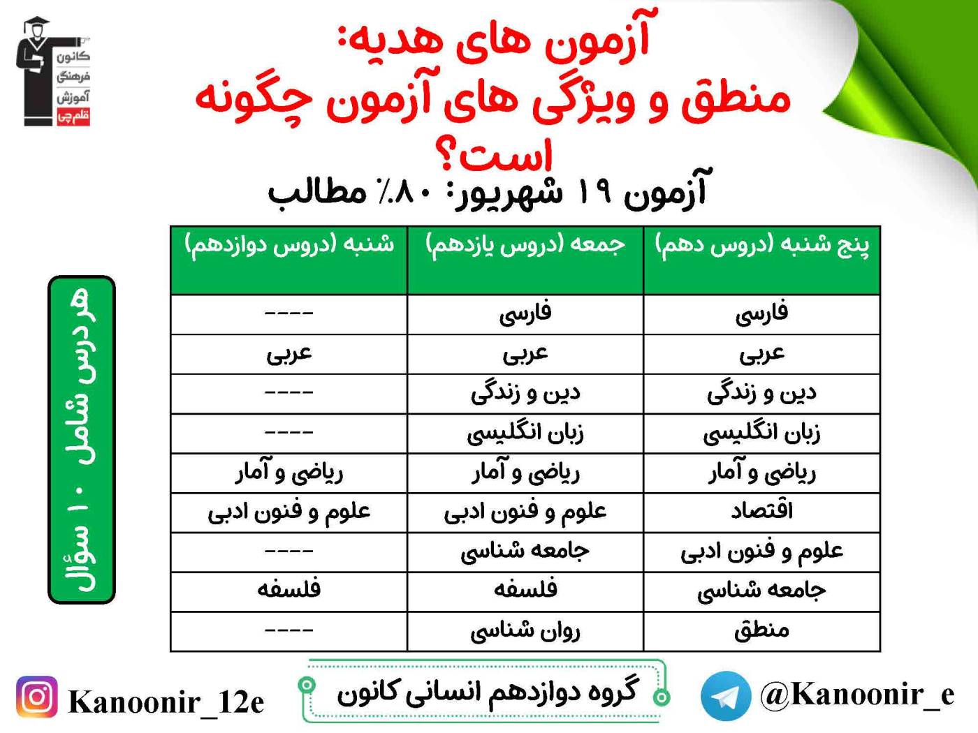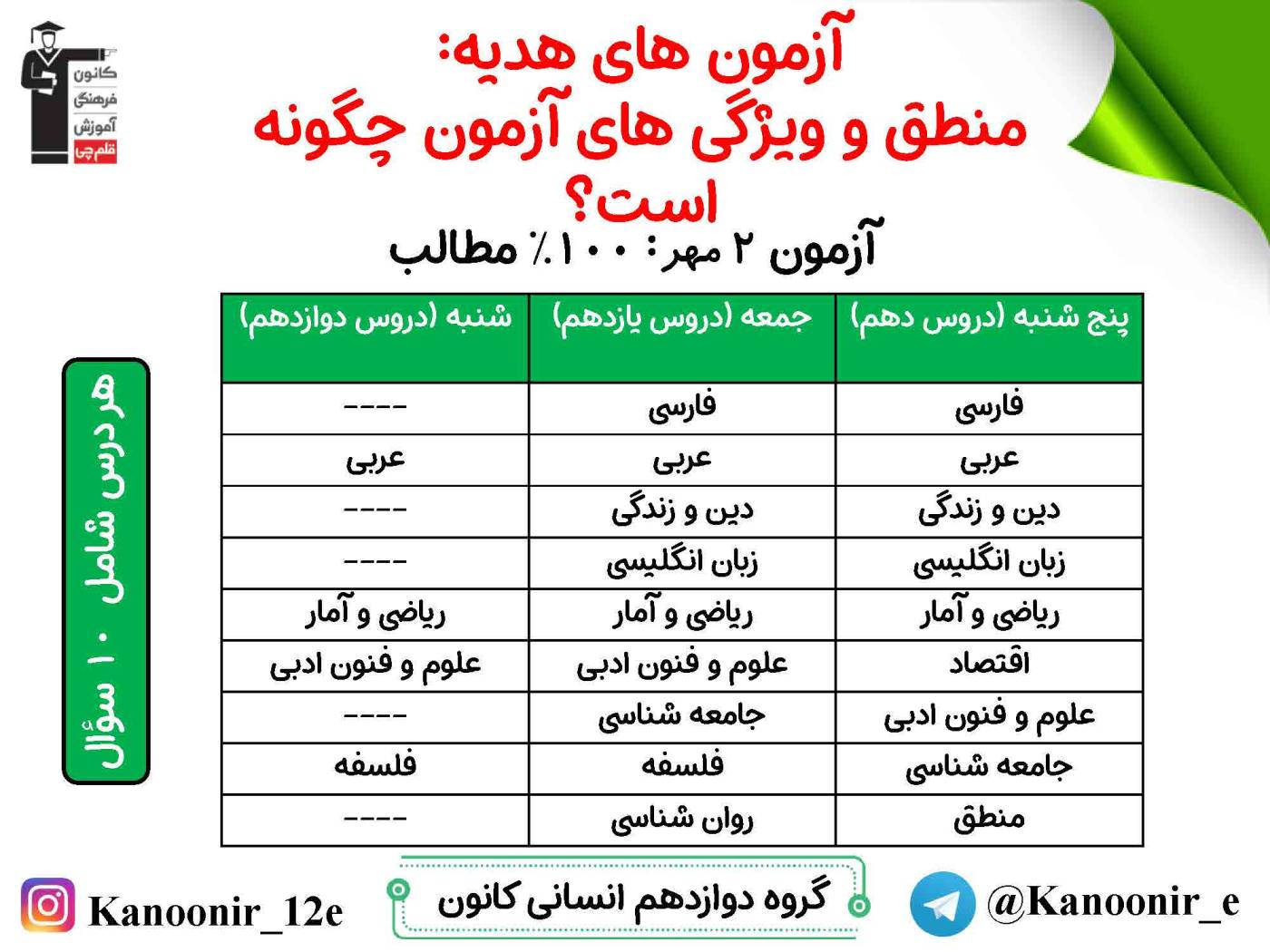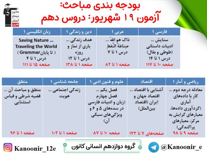 در روز پنج شنبه میتوانید مباحث سال دهم را آزمون دهید، در روز جمعه، مباحث یازدهم را امتحان میدهید و در روز شنبه مباحث دوازدهم (نگاه به آینده) را آزمون میدهید.
