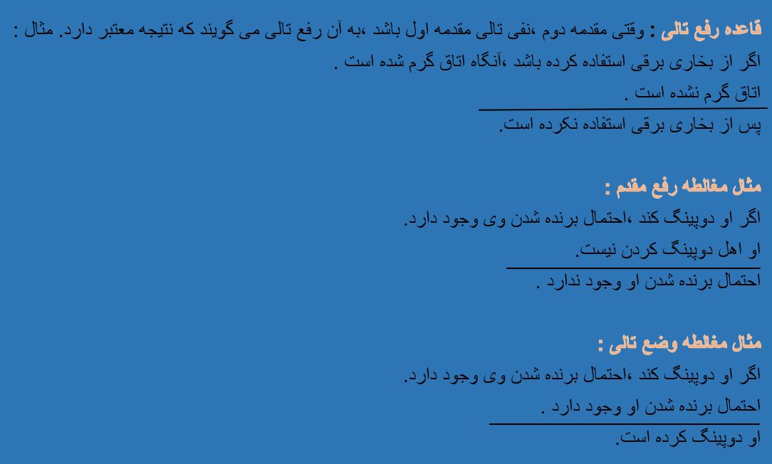 2)اگر علی به خانه آمده بود ، در قفل نبود . در قفل است ، پس علی نیامده است .