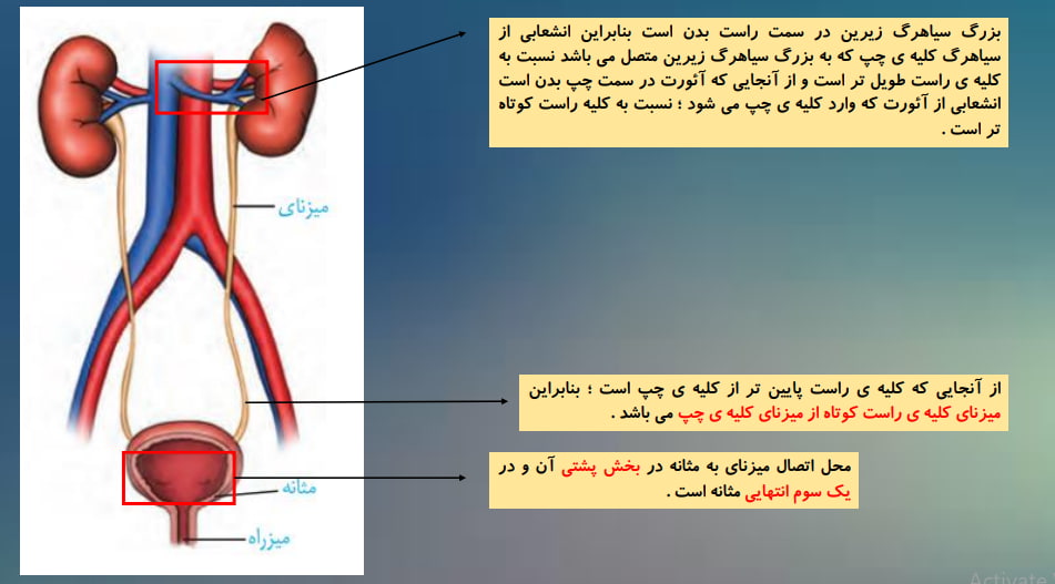 بزرگ سیاهرگ زیرین در سمت راست بدن است بنابراین انشعابی از سیاهرگ کلیه ی چپ که به بزرگ سیاهرگ زیرین متصل می باشد نسبت به کلیه ی راست طویل تر است و از آنجایی که آئورت در سمت چپ بدن است انشعابی از آئورت که وارد کلیه ی چپ می شود ؛ نسبت به کلیه راست کوتاه تر است .