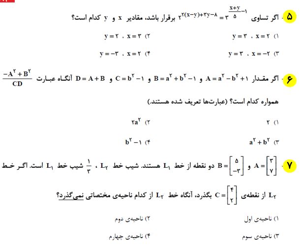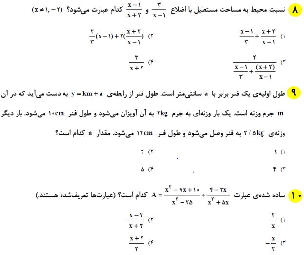 10 سوال ریاضی که در ادامه برای شما قرار دادیم، از مباحث نگاه به گذشته آزمون 12 شهریور بوده و برای آمادگی بیشتر شما در این آزمون تهیه شده است. بعد از مطالعه ی کتاب درسی و درسنامه های آمادگی آزمون 12 شهریور، توصیه میکنم حتما این سوالات را حل کرده و جواب های خود را با پاسخنامه بررسی کنید.