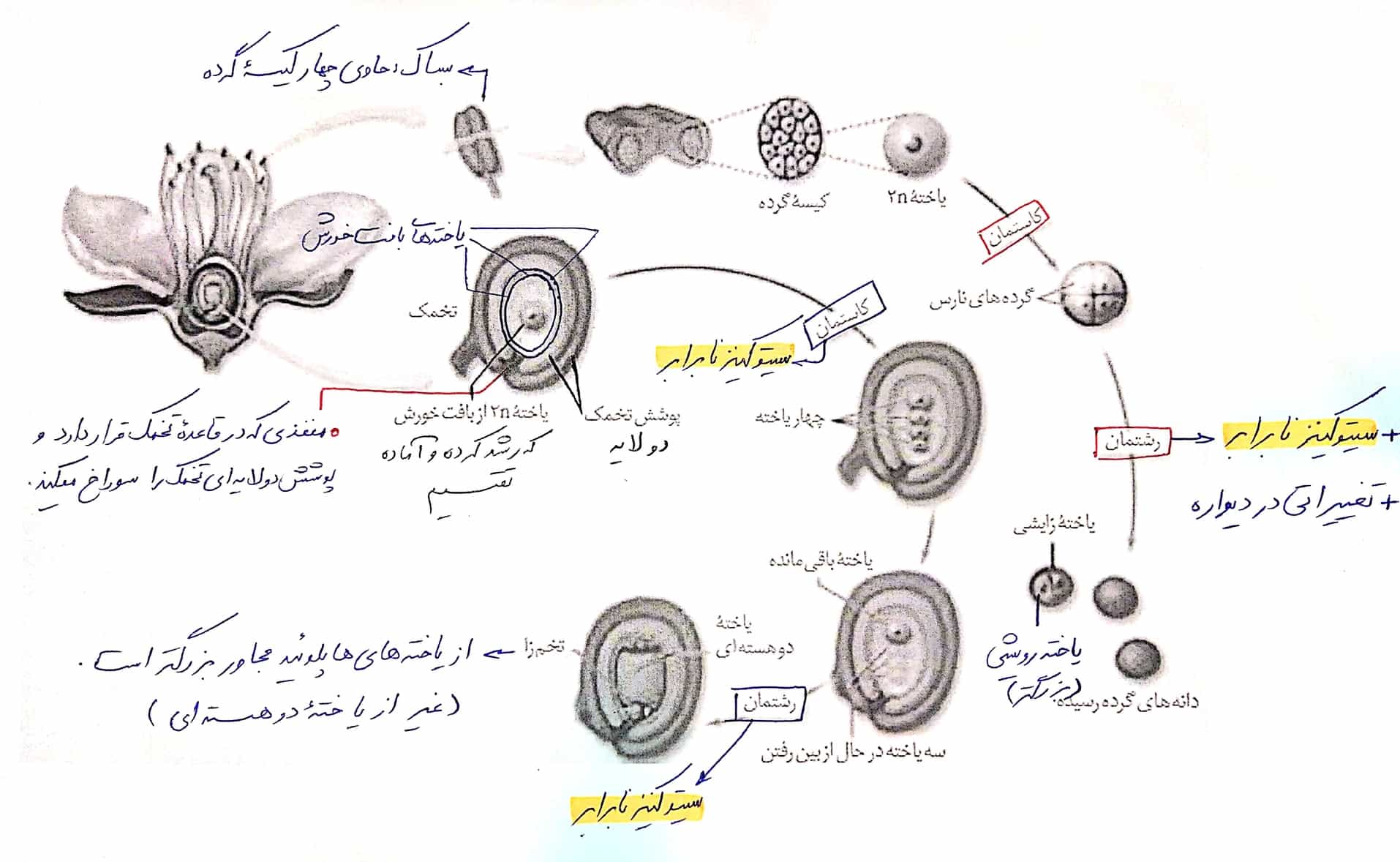 - دقت کنید هر گرده نارس در نهایت می تواند دو گامت نر و در مجموع سه یاخته هاپلوئید تولید کند.