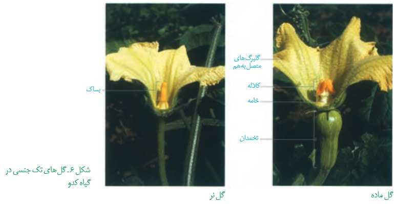 - دقت کنید که در شکل نوشته شده است گلبرگ های متصل به هم. بنابراین گل های گیاه کدو چند گلبرگ دارند که متصل به هم هستند و نمیتوانیم بگوییم که یک گلبرگ دارند.