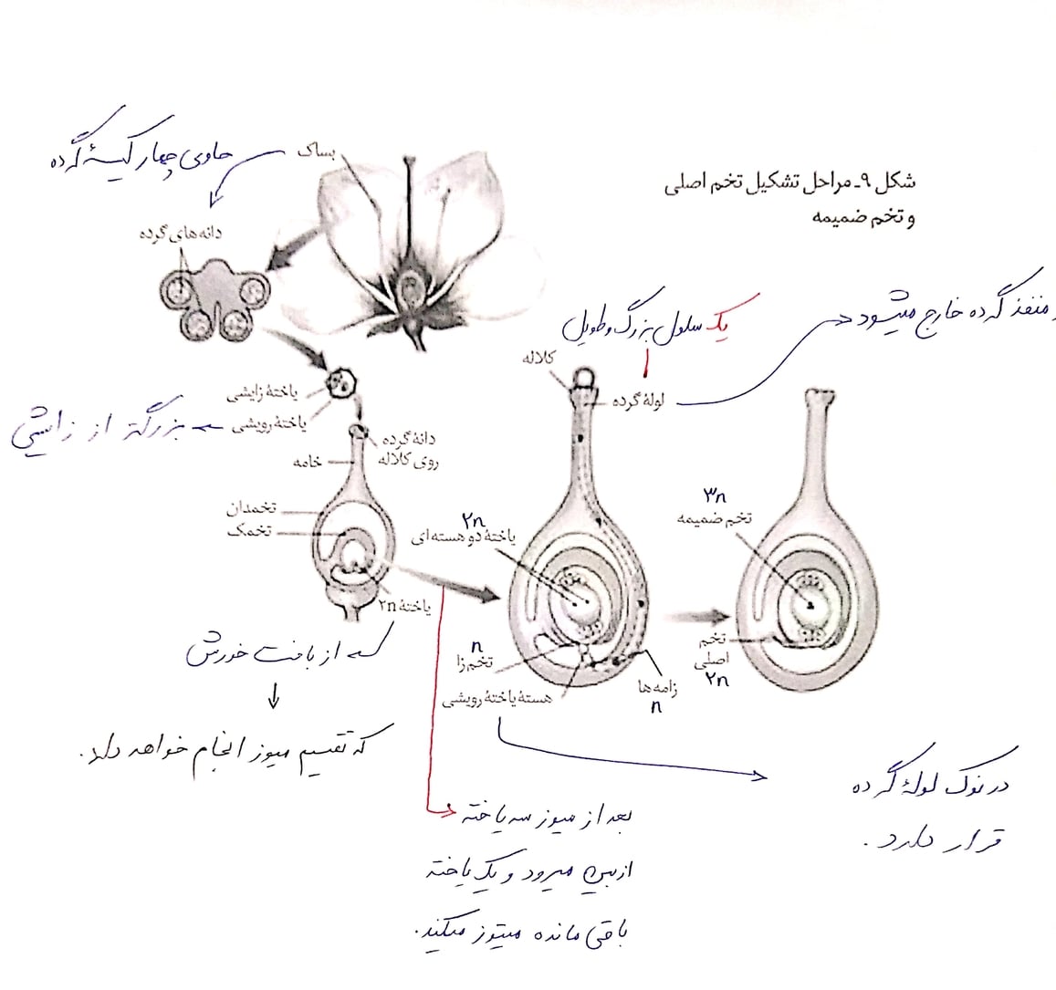 - در ابتدا در تخمک هفت یاخته یه وجود می آید و کیسه ی رویانی تشکیل می شود که شامل یاخته ی تخم زا و یاخته ی دو هسته ای است. بعد از لقاح مضاعف، یاخته ی تخم اصلی و یاخته ی تخم ضمیمه در تخمک به وجود می آیئد. سپس تخم اصلی در رویان نمو می یابد و تخم ضمیمه بافت آندوسپرم را تشکیل می دهد. همچنین پوسته ی تخمک سخت می شود و در نهایت به دانه تبدیل می شود. (دانه حاصل رشد + نمو تخمک است.)
