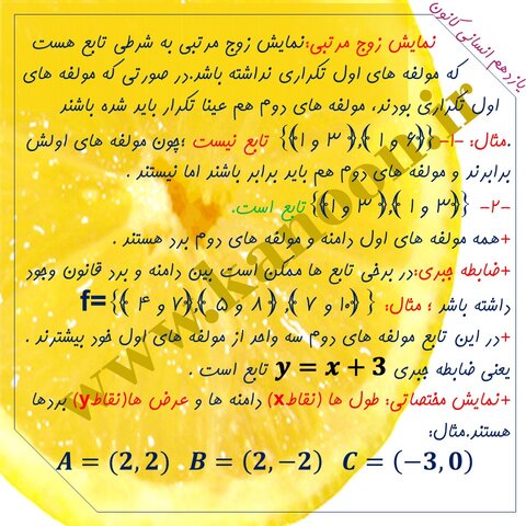 تکراری بودند، مولفه های دوم هم عینا تکرار باید شده باشند .مثال: -1-{﴿6 و 1 ﴾,﴿ 3 و 1﴾} تابع نیست ؛چون مولفه های اولش برابرند و