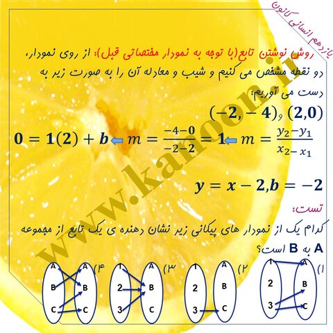 روش نوشتن تابع(با توجه به نمودار مختصاتی قبل): از روی نمودار، دو نقطه مشخص می کنیم و شیب و معادله آن را به صورت زیر به