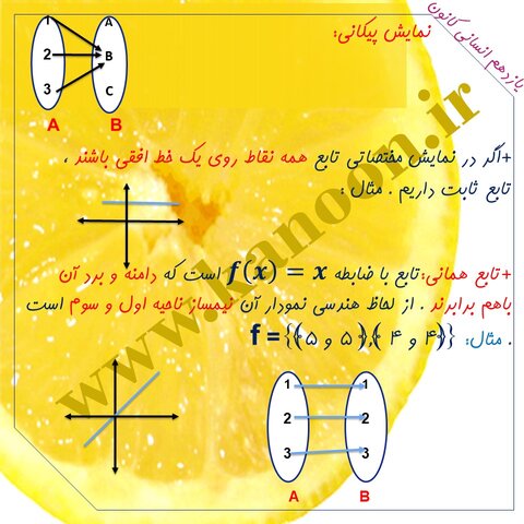 تابع: تابع یک رابطه از مجموعهA به مجموعه B است، درصورتی که به هر عضو مجموعه A فقط یک عضو از مجموعه B نظیر شود.