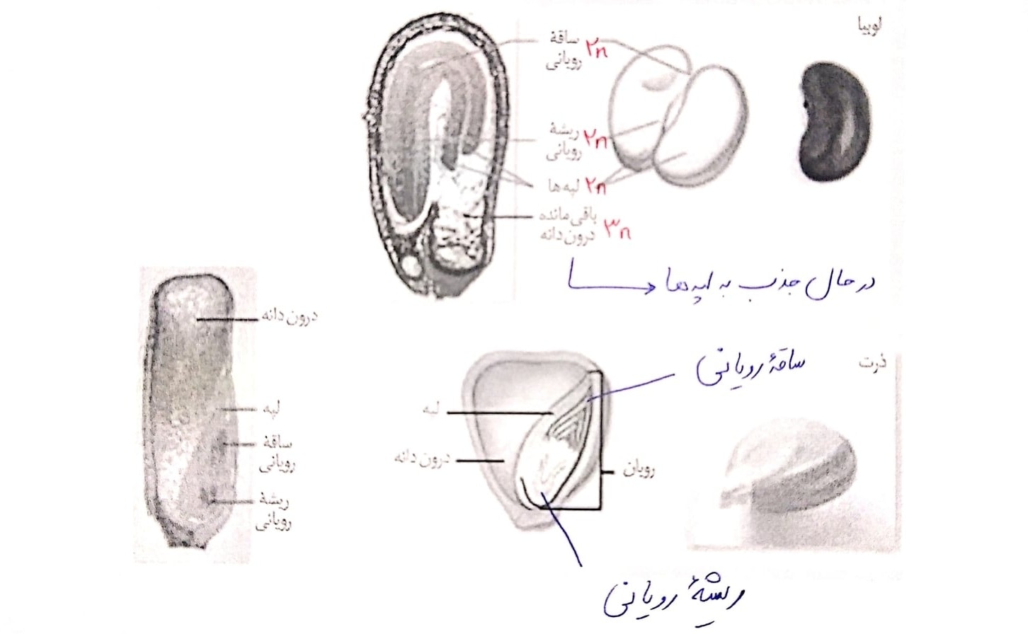 - در دانه ی لوبیا همه ی بخش ها به جز پوسته ی دانه، بخش دیپلوئیدی بعد از لقاح هستند.