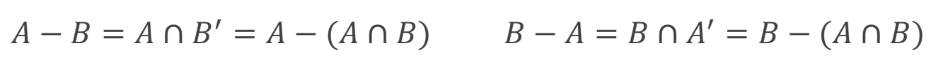 •تفاضل متقارن دو پیشامد: اگر A و B دو پیشامد از فضای نمونهای باشند، پیشامد (A-B)∪(B-A) یا (A∪B)-(A∩B) همان هنگامی اتفاق میافتد که A یا B اتفاق بیفتد ولی هر دو با هم اتفاق نیفتند.(فقط A رخ دهد یا فقط B رخ دهد)