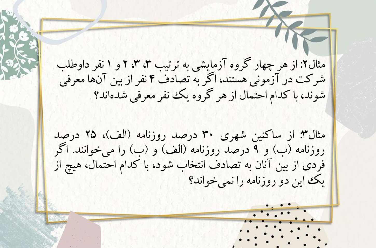پاسخ مثال ها رو میتونید در pdf بارگذاری شده در انتهای مطلب مشاهده کنید.