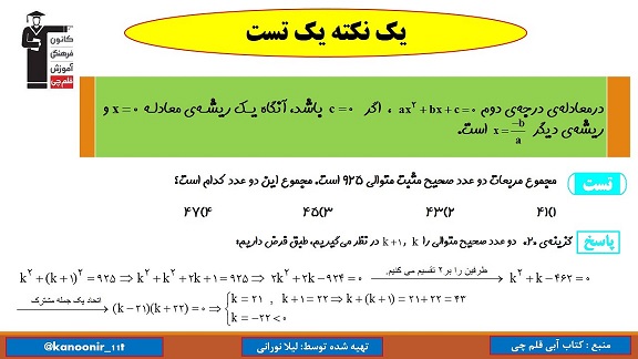 ابتدا معادله درجه دوم و دو اتحاد جمله مشترک و مزدوج یادآوری میشود. و یک نکته برای حل معادلا درجه دوم بیان میکنیم و تستی در رابطه با این مطلب را حل آن را بیان می کنیم.