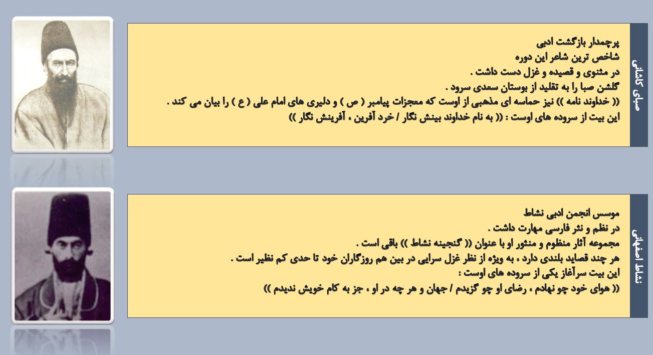 با روی کار آمدن قاجار و تثبیت حکومت مرکزی در ایران ، بازگشت به الگوی گذشتگان در ادبیات ، پررونق تر از گذشته بود .