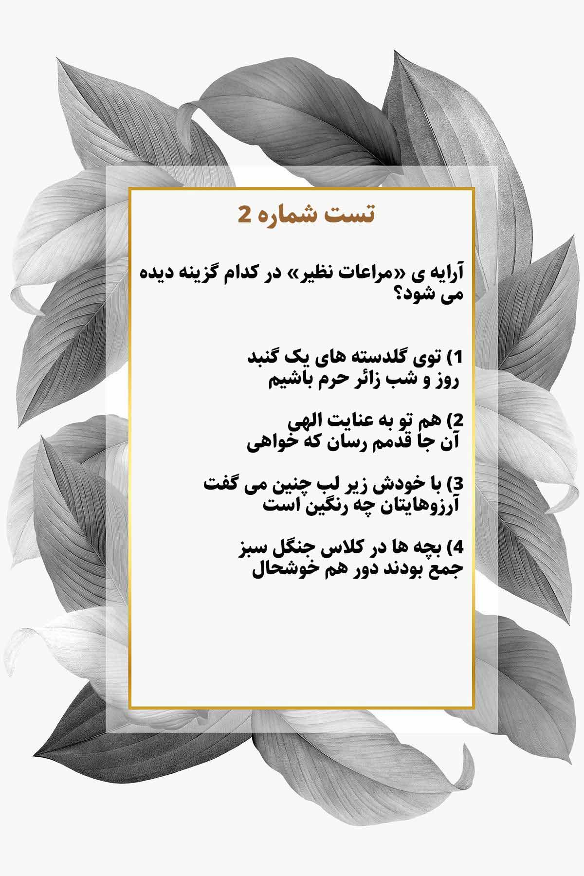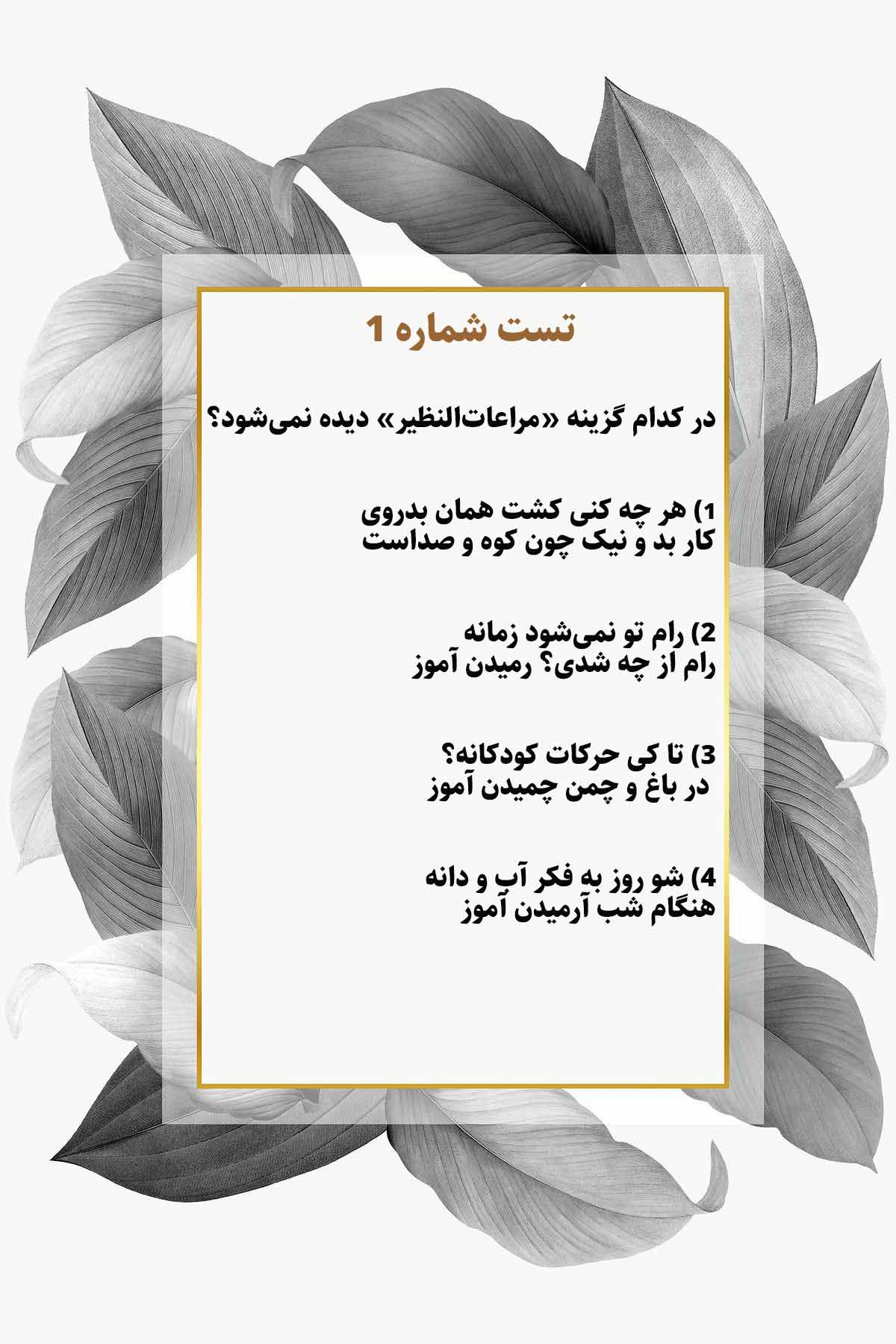 نگاهی مختصر بر مراعات نظیر داشتیم و اکنون زمان این است که مطالب گفته شده را با چند تست تثبیت کنیم: