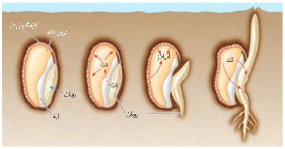 -- رویش دانه نقش دارند -> جیبرلیک اسید: تحریک تولید و ترشح آنزیم های گوارشی لایه ی گلوتن دار (لایه ی خارجی غلات)