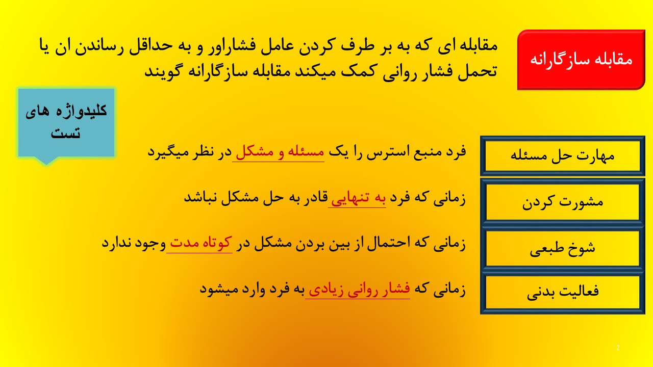 🔔 به تلاش فرد برای از بین بردن فشار روانی یا به حداقل رساندن آن مقابله گفته میشود .