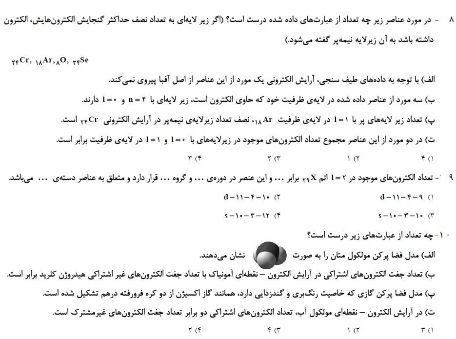 10 سوال شیمی که در ادامه برای شما قرار دادیم، از مباحث نگاه به آینده آزمون 26 شهریور دهم ریاضی بوده و برای آمادگی بیشتر شما در این آزمون تهیه شده است. بعد از مطالعه ی کتاب درسی و درسنامه های آمادگی آزمون 26شهریور، توصیه میکنم حتما این سوالات را حل کرده و جواب های خود را با پاسخنامه بررسی کنید.