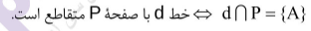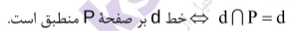 نکته : اگر دو نقطه از یک خط روی صفحه ای باشند انگاه تمام نقاط ان خط روی صفحه قرار دارند یعنی خط بر صفحه منطبق است . اگر دو صفحه متمایز در یک نقطه مشترک باشند انگاه خط راستی که از ان نقطه میگذرد فصل مشترک دو صفحه است .