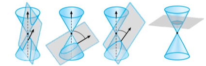 در برخورد صفحه با دو مخروط اگر صفحه عمود بر محور مخروط باشد مقطع یک دایره است و اگر بر ان عمود نباشد و با هیچ یالی نیز موازی نباشد مقطع یک بیضی است و اگر موازی یال باشد مقطع یک سهمی است و در غیر اینصورت مقطع یک هذلولی است .