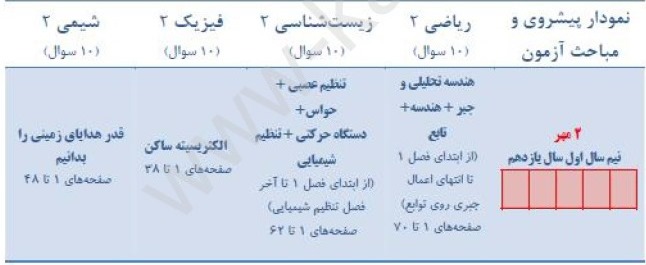 در آزمون 2مهر، که به مرور مطالب سال دهم اختصاص یافته است، قسمت نگاه به گذشته (پایه دهم) دروس اختصاصی سال دهم که در طول تابستان یکبار به صورت برنامهریزی شده و گامبهگام بازخوانی و ارزیابی شده به طور کامل برای شما جمعبندی شده و هر درس در قالب یک آزمون 10سوالی مورد پرسش قرار میگیرد. سعی شده در انتخاب سوالات این آزمون، پوشش مطالب و سطح دشواری به شکلی رعایت شود که سوالات از مباحث مهم و پرتکرار در کنکورهای سه سال اخیر طرح شده و سطح دشواری سوال مرتبط با هر مبحث نیز با سطح دشواری سوالات کنکور سراسری قرابت داشته باشد.