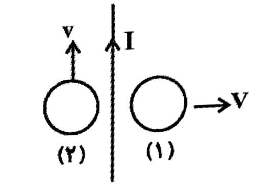 مطابق شکل زیر ، دو حلقۀ رسانا در مجاورت یک سیم نازک ، مستقیم و دراز که حامل جریان ثابت I است ، در یک صفحه قرار دارند . این دو حلقه با سرعت های ثابت و یکسان ولی در جهت های متفاوت حرکت می کنند . در این حالت در ... نیروی محرکه ای القا نمی شود و همچنین سوی جریان القایی ایجاد شده در ... خواهد بود .