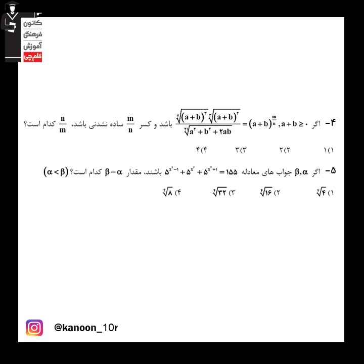5 سوال ریاضی دهم که در ادامه برای شما قرار دادیم، از مبحث توان های گویا آزمون 2 دی دهم ریاضی بوده و برای آمادگی بیشتر شما در این آزمون تهیه شده است. بعد از مطالعه ی کتاب درسی و درسنامه های آمادگی آزمون 3 دی، توصیه میکنم حتما این سوالات را حل کرده و جواب های خود را با پاسخنامه بررسی کنید.