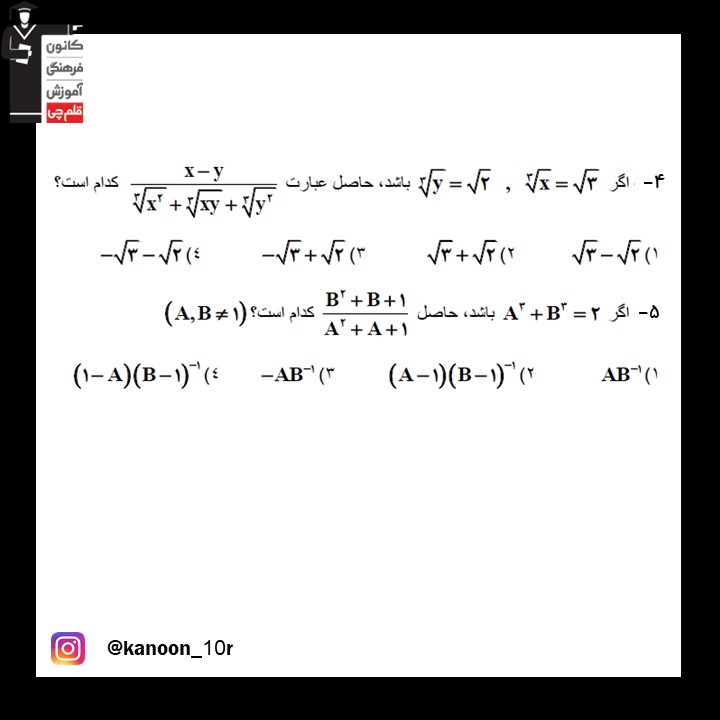 5 سوال ریاضی دهم که در ادامه برای شما قرار دادیم، از مبحث عبارت های جبری (مباحث نگاه به آینده) آزمون 26 شهریور دهم ریاضی بوده و برای آمادگی بیشتر شما در این آزمون تهیه شده است. بعد از مطالعه ی کتاب درسی و درسنامه های آمادگی آزمون 26شهریور، توصیه میکنم حتما این سوالات را حل کرده و جواب های خود را با پاسخنامه بررسی کنید.