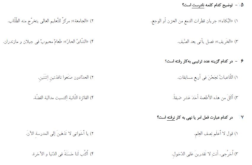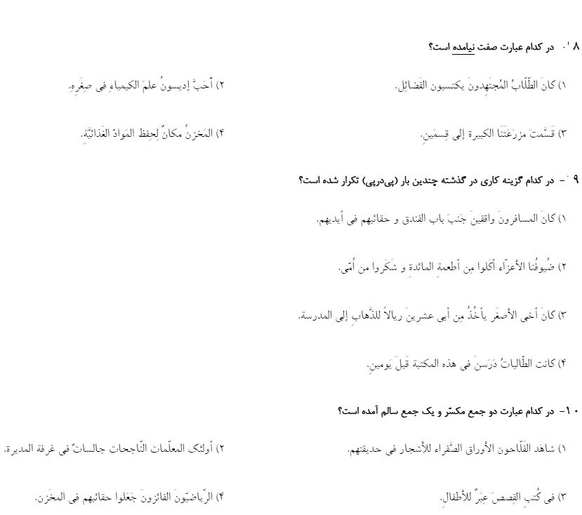 10 سوال عربی نهم که در ادامه برای شما قرار دادیم، از مباحث آزمون 8 مهر بوده و برای آمادگی بیشتر شما در این آزمون توسط فاطمه احدزاده رتبه 373 رشته ریاضی سال 95 انتخاب و برای شما قرار داده شده است. بعد از مطالعه ی کتاب درسی و درسنامه های آمادگی آزمون 8 مهر، توصیه میکنم حتما این سوالات را حل کرده و جواب های خود را با پاسخنامه بررسی کنید.