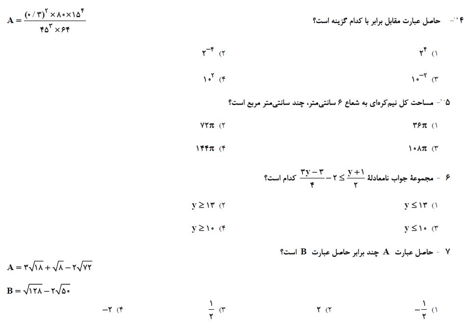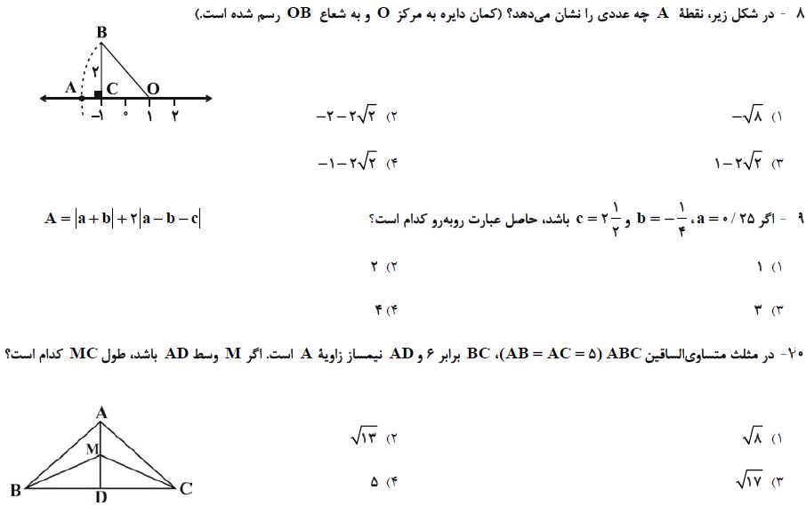 10 سوال ریاضی نهم که در ادامه برای شما قرار دادیم، جمع بندی مباحث آزمون 8 مهر بوده و برای آمادگی بیشتر شما در این آزمون توسط فاطمه احدزاده رتبه 373 رشته ریاضی سال 95 انتخاب و برای شما قرار داده شده است. بعد از مطالعه ی کتاب درسی و درسنامه های آمادگی آزمون 8 مهر، توصیه میکنم حتما این سوالات را حل کرده و جواب های خود را با پاسخنامه بررسی کنید.
