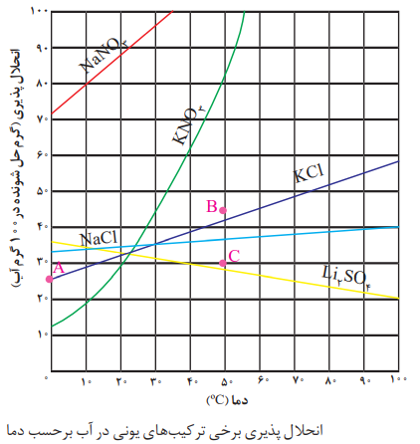 نکته: در این نمودار، نقاط روی منحنی نشان دهنده محلول سیر شده، نقاط زیر منحنی نشان دهنده محلول سیر نشده و نقاط بالای منحنی نشان دهنده محلول فراسیر شده است.