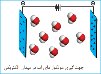 نحوۀ جهت گیری مولکول های آب در میدان الکتریکی نشان میدهد که اتم اکسیژن، سرِ منفی و اتمهای هیدروژن، سرِ مثبت مولکول را تشکیل می دهند. شیمیدان ها به مولکول هایی مانند آب که در میدان الکتریکی جهت گیری می کنند، مولکول های دوقطبی یا قطبی می گویند.