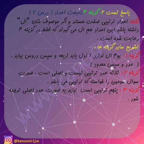 اعداد ترتیبی صفت هستند و اگر موصوف شان "ال" داشته باشد این اعداد هم ال می گیرند که فقط در گزینه 4 رعایت شده است .